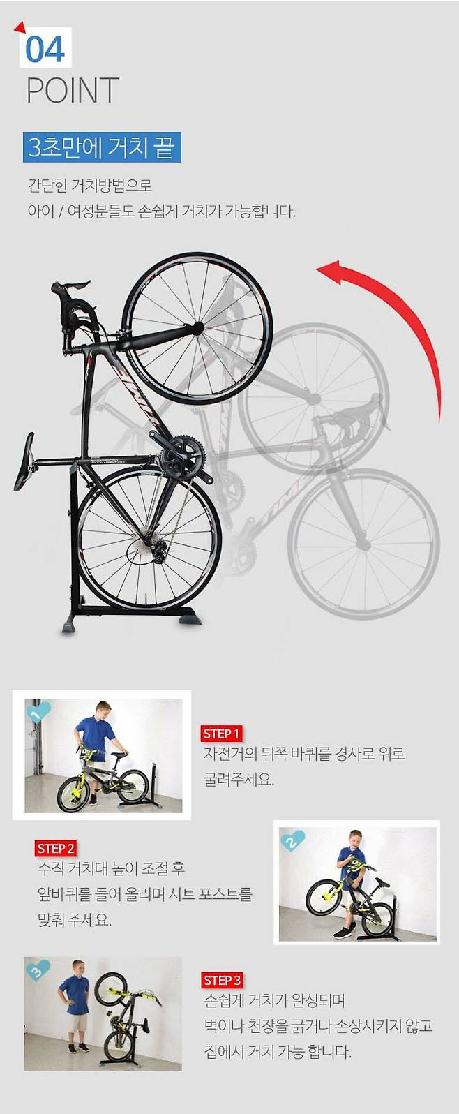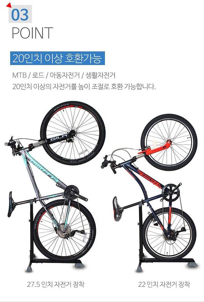 특징 : 사용하기 쉬운 직립형 디자인 20인치 이상의 자전거 거치 가능
