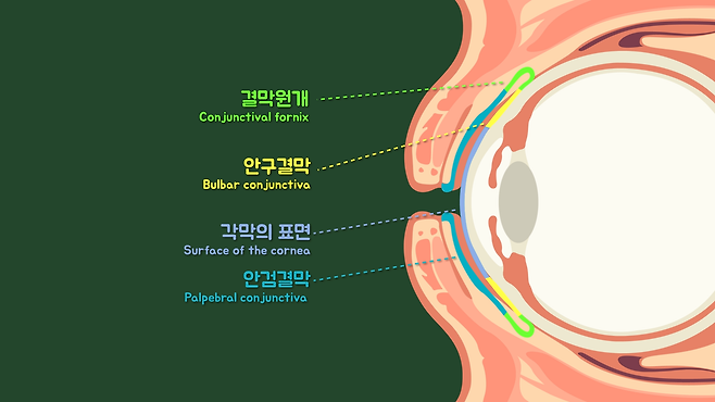 투명해서 잘 몰랐을 텐데, 결막을 세분해서 보면 위와 같고, 보시다 시피 안구의 앞부분부터 눈꺼풀 안쪽까지 이어져 있습니다.
