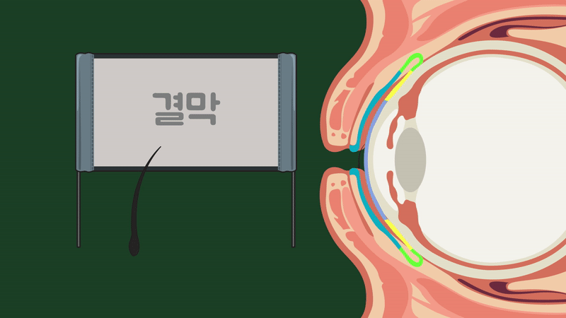 즉, 결막에 의해 막혀있으므로 눈썹은 당연히 안구 뒤로 넘어갈 수 없고, 안쪽 결막원개까지 깊숙이 들어간다고 하더라도 시간이 지나면 결국 눈물에 씻겨서 빠져나옵니다.
