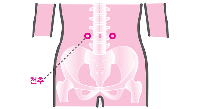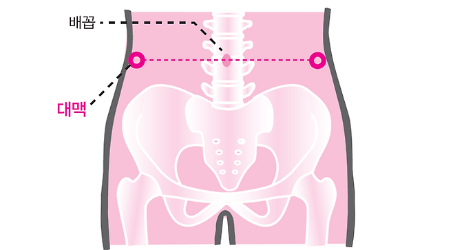 ‘천추’는 소화 기능을 높이며, 가스가 차서 배가 빵빵해졌을 때도 효과적인 혈자리입니다. ‘대맥’은 기의 흐름을 원활히 하여 신진대사를 높여 배 주변 근육을 조여주는 혈자리입니다.