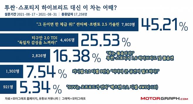그럼에도 투싼이나 스포티지를 선택하겠다는 독자들도 2826명(16.38%)이나 됐다. 가장 최근에 출시된 신차이며, 최신 고급 안전 및 편의 옵션을 선호하기 때문이다.
