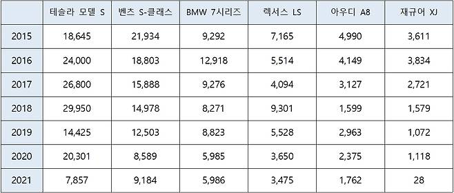 한편, ‘별들의 전쟁’이 변곡점을 맞았다. 2015년부터 올해 3분기까지 주요 프리미엄 브랜드 기함의 미국 시장 판매량을 집계해봤다. 시장이 서서히 줄어들고 있다. 코로나19 대유행과 반도체 수급난은 이 같은 추세에 가속을 붙였다. 테슬라 모델S의 약진 또한 눈여겨 볼만하다. 저울질한 경쟁 차종을 매년 집계마다 압도했다. 트렌드 세터이자 게임 체인저다.