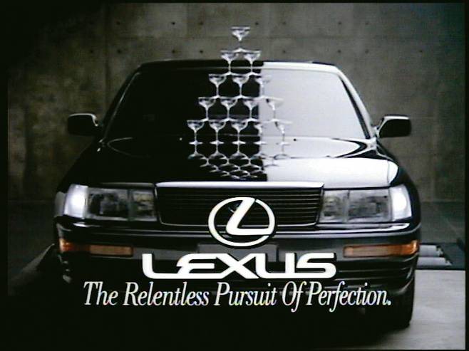 하지만 결국 해냈다. 1989년 5월 등장한 렉서스 LS400은 어떤 경쟁자도 엄두내지 못한 탁월한 품질로 압도하며 순식간에 시장을 삼켜나갔다. 품질을 보여주는 대표적 일화(광고)가 있다. 렉서스는 LS400 보닛 위에 와인 잔을 쌓고 출력 계측기 위에 올라 계기판 바늘이 시속 240㎞를 넘기도록 뒷바퀴를 굴렸다. 하지만 와인 잔속의 물은 출렁이지 않았다.