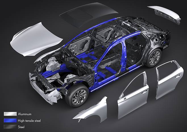 4세대 때 보닛에만 썼던 알루미늄 합금은 이제 펜더와 도어, 트렁크 리드까지 넓혔다. 고장력 강판 사용비율은 31%로 두 배 이상, 비틀림 강성은 1.8배 높다. 차체 변형과정도 달라졌다. 기존엔 비틀림을 버티다 확 변형되었는데, 신형 LS는 LSW와 굴곡부 결합 효율 향상 등의 요인 덕분에 더 강력히 버틴다. 비틀림 역시 급작스럽게 진행되지 않는다.