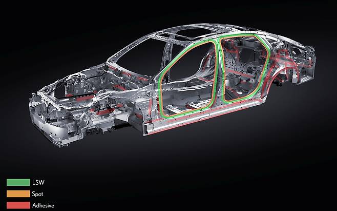 렉서스는 5세대 LS의 차체강성을 높이기 위해 다양한 시도를 했다. 단단한 차체는 운동성능뿐 아니라 안전에도 도움이 되기 때문. 예컨대 구조용 접착제를 86m나 쓴다. LC보다 13m 더 썼다. 용접은 렉서스의 상징 중 하나인 ‘레이저 스크류 웰딩(Laser Screw Welding, 이후 LSW)’ 공법을 썼다. 레이저를 소용돌이처럼 돌려 깊숙이 녹여 붙이는 기술이다.