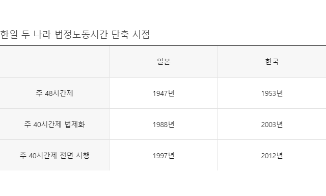 법정노동시간 단축의 경우 일본이 한국에 비해 느렸다고 보기도 어렵다. 한국은 1953년에 주 48시간제를 확립했고, 일본이 주 40시간제를 명문화한 후 1989년에 주 44시간제를 도입했다. 주 40시간제(주 5일제)가 법으로 명문화한 것은 2003년이다.