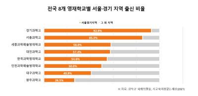 세종과학예술영재학교는 세종지역 출신 15.9%보다 서울·경기 출신이 58%로 3.6배 가량 많았고, 한국과학영재학교와 대전과학고도 각각 소재지 부산과 대전 출신 합격자보다 서울·경기 출신이 2.5배, 2.1배 가량 많았다.