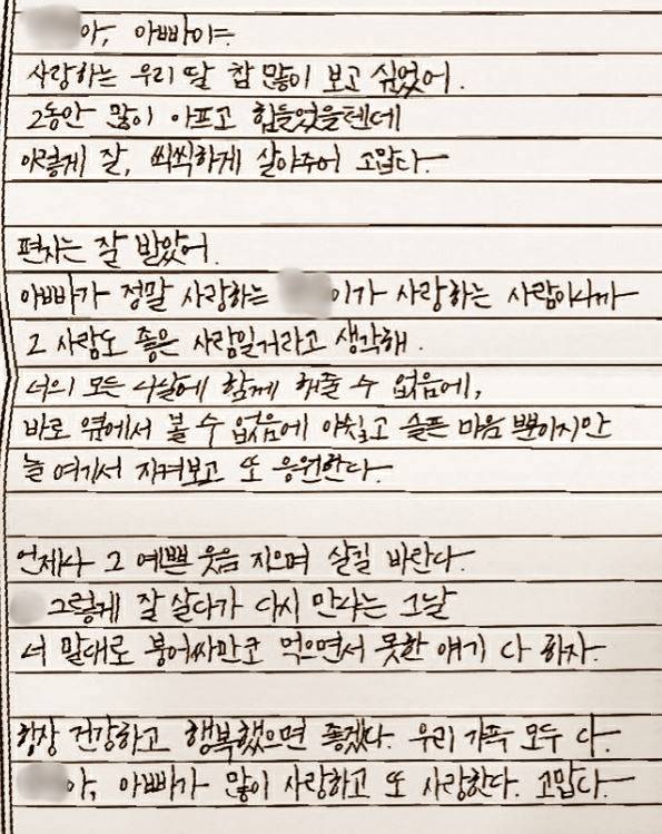 집에 들어가자마자 아빠의 노트가 생각났어요. 찾아보니 아빠의 유서가 있더라고요. “건강해라 행복해라.” 장례식장에서 경찰들 질문을 2시간 가까이 받았어요. 지쳐서 눈물도 나오지 않더라고요. 나중에 남자친구를 보고서야 홍수처럼 눈물이 나왔어요.