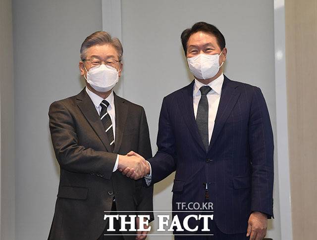 [더팩트ㅣ남윤호 기자] 최태원 대한상공회의소 회장(오른쪽)이 10일 서울 중구 세종대로 대한상공회의소에서 열린 이재명 더불어민주당 대선후보와의 간담회에서 '미래를 위한 경제계 제언'이란 책을 이 후보에게 선물하고 있다.