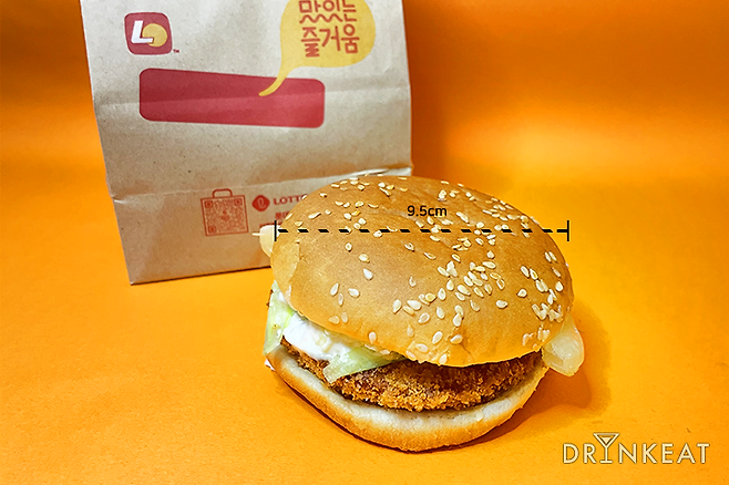 사이즈는 9.5센티미터로 맥도날드 슈슈버거와 비슷했습니다. 하지만 번과 패티가 슈슈버거보다 훨씬 단단했고, 양상추가 넉넉하게 들어있음에도 불구하고 번과 패티가 눅눅하지 않아 축 처지지 않고 전체적으로 모양이 잘 잡혀 있었어요.