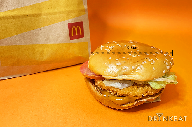 맛을 보기에 앞서, 사이즈부터 재 봤습니다. 번의 가로 길이는 9.5센티미터. 버거를 받은 후 바로 포장을 열어 보았음에도 불구하고 번과 속재료가 살짝 눅눅해져 있었어요. 비주얼 역시, 먹기 쉽도록 모양이 잡혀 있다기보다는 약간 자유분방한 느낌.