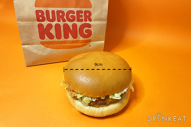 사이즈는 9.5센티미터로 맥도날드 슈슈버거와 비슷했습니다. 하지만 번과 패티가 슈슈버거보다 훨씬 단단했고, 양상추가 넉넉하게 들어있음에도 불구하고 번과 패티가 눅눅하지 않아 축 처지지 않고 전체적으로 모양이 잘 잡혀 있었어요.