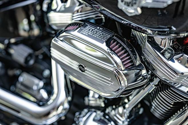 타원형의 에어클리너박스는 K&N의 고성능 필터를 내장한 스크리밍 이글의 하이플로우 필터를 장착하고 깔끔한 마무리가 돋보이는 디파이언스 에어클리너 트림으로 장식했다. 세 줄의 장식이 더해진 상단 로커커버 역시 다파이언스 컬렉션 제품이다. 에어필터는 세척을 통해 반영구적인 사용이 가능하다.