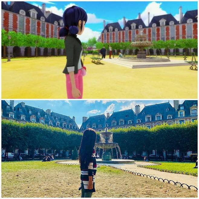 다음은 딸. 인기 애니메이션 '미라큘러스:레이디버그와 블랙캣'에 등장하는 곳에서 인증샷을 찍은 주걸륜 부부의 딸의 모습이다.