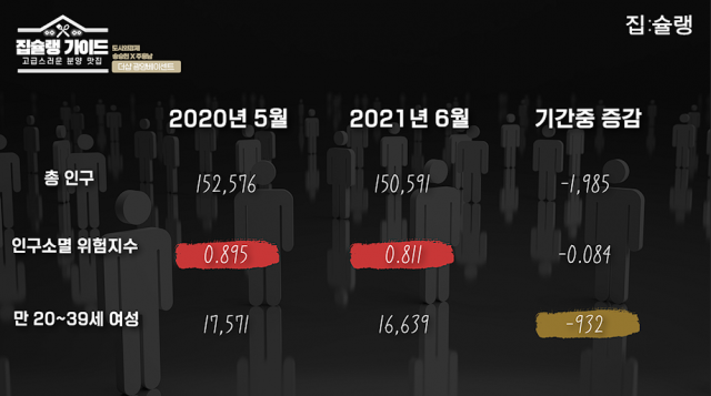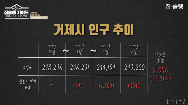 인구가 급감하는 또 다른 지역인 거제시의 상황을 살펴봤다. 거제시 역시 주 산업인 조선 산업의 경기 둔화로 인해 빠른 속도로 인구가 줄어들고 있다. 통계청에 따르면 2019년 12월 대비 2021년 6월 말 거제시의 인구 증감률은 ?2.04%를 기록했다.