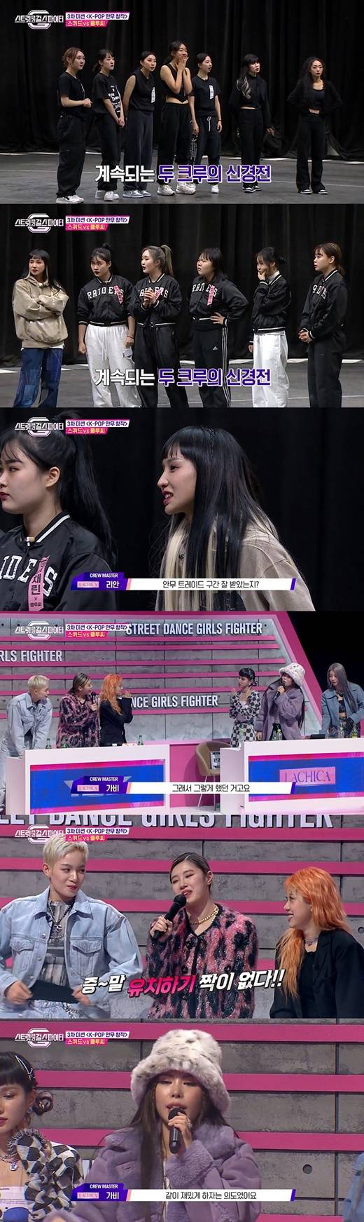 지난 28일 방송된 '스트릿댄스 걸스 파이터'(이하 '스걸파') 참가 크루 클루씨가 보여준 태도에 비매너 지적이 이어지고 있다. 이날 클루씨(팀 라치카)는 탈락이 결정되는 데스매치에서 상대팀인 스퀴드(팀 YGX)에게 다소 난해한 트레이드 안무를 줬다.