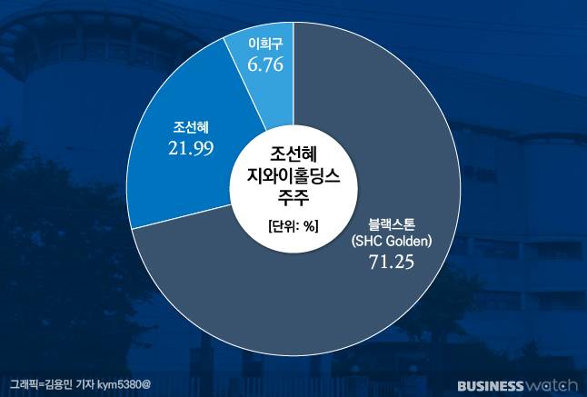 당시 조 회장이 보유한 ㈜지오영 지분은 17.49%다. 이를 1900억원가량에 조선혜지와이홀딩스 매각한 뒤 약 1300억원은 지주회사에 재투자가 이뤄졌다. 조 회장이 현재 홀딩스 지분 21.99%를 보유 중인 이유다. 공동창업자인 이 명예회장(6.76%)의 3배가 넘는다. 블랙스톤(SHC Golden)이 지분 71.25%로 1대주주지만 재무적투자자(FI)일 뿐이다.