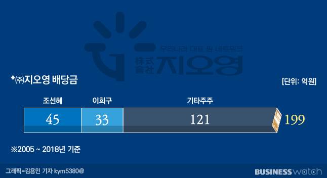 ㈜지오영은 2005년부터 시작해 조 회장 주주로 있던 2019년까지 단 한 해도 주주들에게 배당을 거른 적이 없다. 많게는 25억원 도합 199억원이다. 이 기간 조 회장이 손에 쥔 배당금이 45억원가량이다.