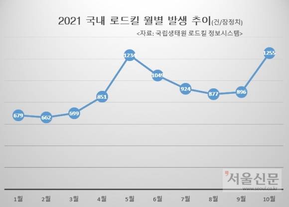 25일 국립생태원 로드킬 정보시스템, 한국도로공사 등에 따르면 2015년부터 지난해까지 6년 동안 전국 도로에서 차에 치인 동물은 10만 마리에 이르렀다. 한해 평균 1만 6500마리가 로드킬을 당한 셈이다. 올해는 지난달까지 1만여건의 로드킬이 발생한 가운데 10월 로드킬 사고 건수(1255건)는 올들어 가장 높은 수치를 기록했다.