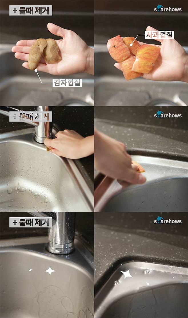 음식을 하고 나오는 껍질들로 청소해주세요. 과일 껍질, 감자 껍질 등으로 닦아주면 잘 닦인답니다.