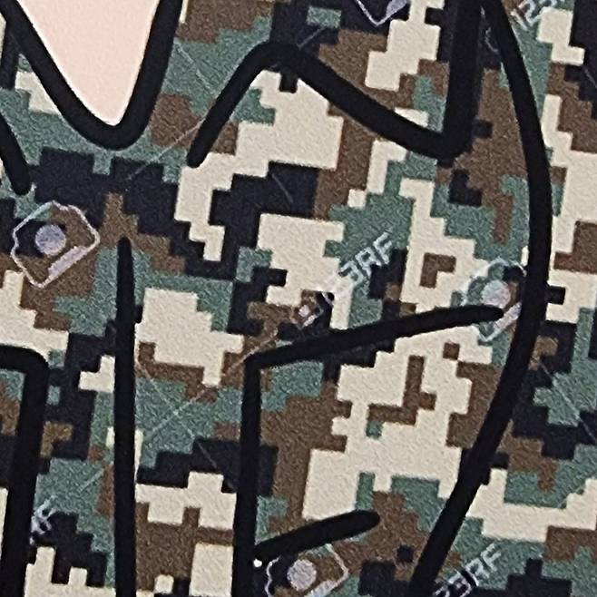 원래는 제 작품 ‘짬’에 들어간 구형 위장무늬 패턴을 사용할까 하다가 시대가 바뀐만큼 픽셀으로 넣어야겠다고 생각하고 인터넷에 위장무늬 패턴을 검색해 다운로드해서 사용했습니다.