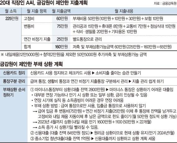 금융감독원은 A씨에게 부채가 더 늘지 않고 상환해 나갈 수 있도록 현재 상황을 제대로 파악하고 소득과 지출예산, 재무목표 관리를 위한 구체적 계획을 수립하라고 조언했다.