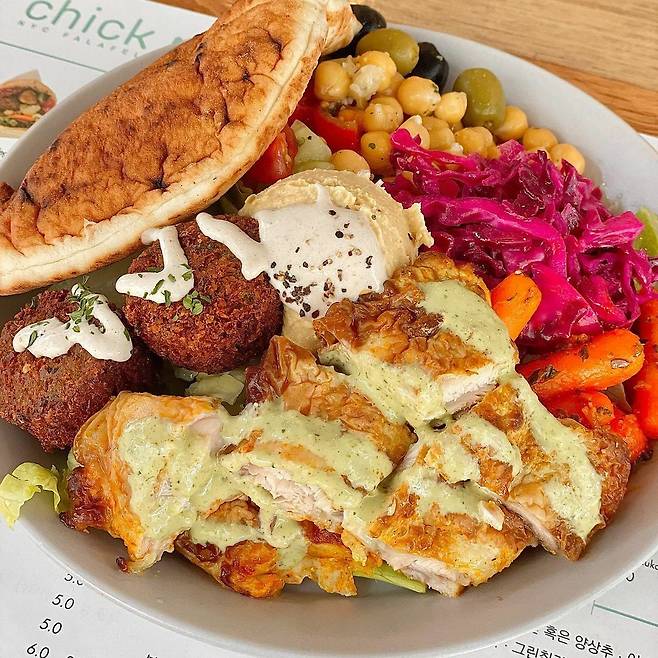 지중해식으로 건강하고 풍성한 식단을 꾸릴 수 있는 샐러드 맛집. 특히 병아리콩을 으깨 만든 고로케의 일종인 팔라펠과 납작한 그리스식 빵, 피타를 만날 수 있다. 샐러드에도 병아리콩을 으깨 만든 소스인 후무스가 소스처럼 얹어져 있어 고기 없이도 단백질을 알차게 채울 수 있는 게 특징!