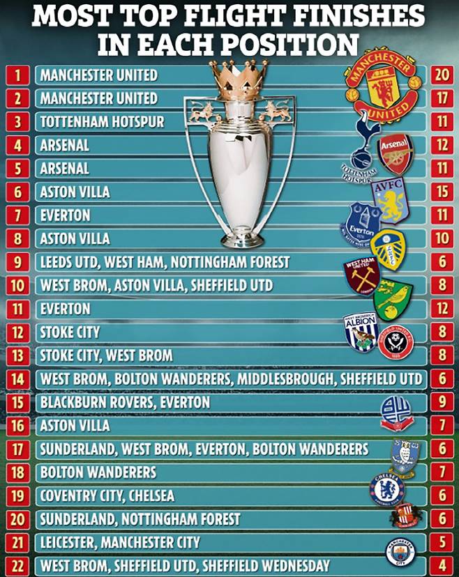 최상단 1, 2위에는 맨체스터 유나이티드가 위치했다. 맨유는 통산 20회 우승에 알렉스 퍼거슨 감독 아래 20년 동안 EPL 우승컵을 13개 거머쥐며 화려한 전성기를 보냈다. 2위도 17차례 기록할 만큼 매년 치열한 우승 후보로 거론되며 강팀 면모를 보여줬다.