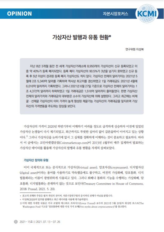 이 연구위원은 “8년 3개월 동안의 암호화폐 발행과 유통 현황을 살펴본 결과, 암호화폐는 대중에게 그 발행 목적 또는 경제적 기능과 무관하게 자본이득을 볼 수 있는 투자대상으로 인식되며 주식과 같은 방식으로 거래되고 있다는 것을 확인할 수 있다”며 “그럼에도 불구하고 암호화폐의 40%가 등록 폐지되었다는 점과 암호화폐의 가격이 하루 사이에도 이해하기 어려울 정도로 변동하고 있다는 점을 고려할 때 투자에 나서는 개인들에게 상당한 주의가 요구된다”고 강조했다.