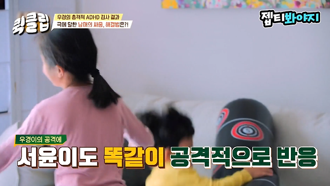 장난이라고 하기엔 너무 과격하게 다투는 남매도 공포였다. 이지현은 "어느 날 화장실에 갔다 와보니 우경이는 칼을 들고 있고, 서윤이는 가위를 들고 있더라. 거의 어른들이 패싸움 하듯이 한다. 우리집은 진짜 공포다"라고 말했다.