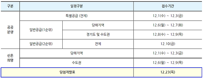 ‘공공분양주택’의 경우 12.1(수)~12.3(금)까지 사흘 간 특별공급에 대한 청약신청 접수가 진행되며, 12.6(월)~12.7(화)에는 일반공급 1순위 중 당해지역 거주자, 12.8(수)~12.9(목)에는 경기도ㆍ수도권 거주자 접수를 시행하고, 일반공급 2순위 대상자는 12.10(금)에 일괄로 청약신청 접수가 있을 예정입니다.