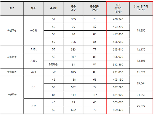 이번 공급지구 중 하남교산ㆍ시흥하중 등 대부분 지역이 3~4억 원대이나, 지가가 높고 84형이 포함된 과천주암 지구는 5~8억 원대의 추정분양가가 산출되었으며, 3.3m2(평)당으로는 하남교산ㆍ시흥하중ㆍ양주회천이 11,621~18,550천원, 과천주암은 24,859~25,064천원 수준이 될 전망입니다.