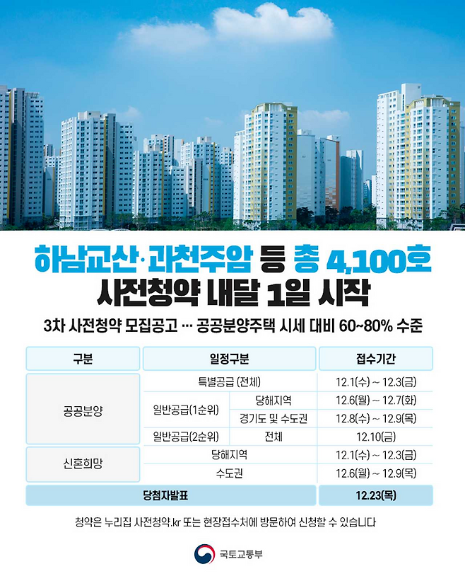 ‘공공분양주택’의 경우 12.1(수)~12.3(금)까지 사흘 간 특별공급에 대한 청약신청 접수가 진행되며, 12.6(월)~12.7(화)에는 일반공급 1순위 중 당해지역 거주자, 12.8(수)~12.9(목)에는 경기도ㆍ수도권 거주자 접수를 시행하고, 일반공급 2순위 대상자는 12.10(금)에 일괄로 청약신청 접수가 있을 예정입니다.