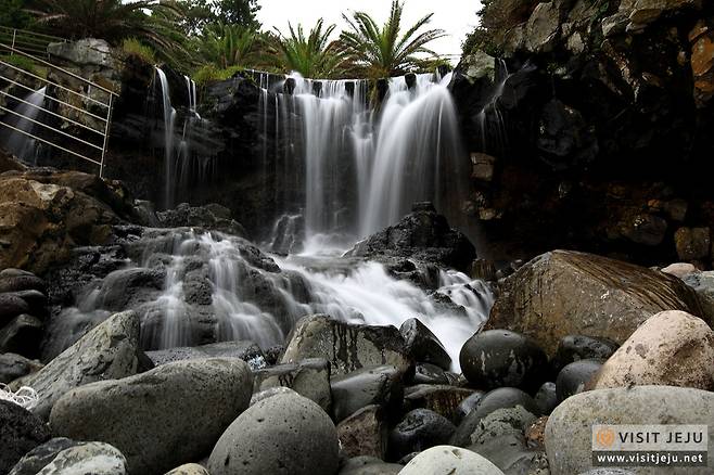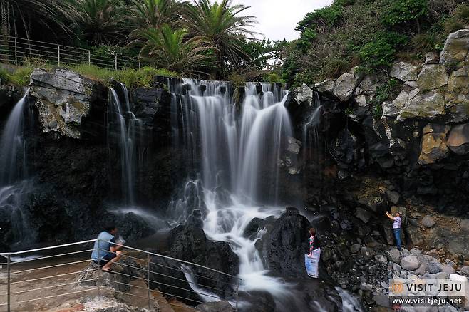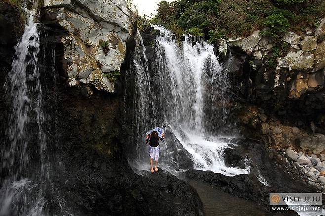 정방폭포에서 동쪽으로 300M정도 가면 낮은 높이의 물줄기가 있는데 이곳이 소정방폭포입니다. 5M의 낮은 높이의 폭포라 떨어지는 폭포를 맞기 위해 많은 사람들이 찾고 있어요.