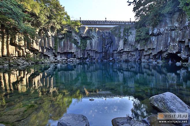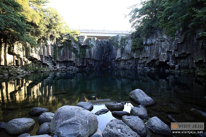 천제연 제1폭포는 길이 22M, 수심 21M의 소를 이루며, 이 물이 흘러내려 다시 제2, 제3의 폭포를 만드는 곳인데요. 주변에 희귀식물인 송엽란, 담팥수 등이 자생한다고 합니다.