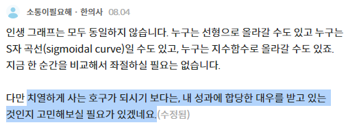 "인생 그래프는 모두 동일하지 않습니다. (...) 다만 치열하게 사는 호구가 되시기 보다는, 내 성과에 합당한 대우를 받고 있는 것인지 고민해보실 필요가 있겠네요." (소통이필요해 · 한의사)