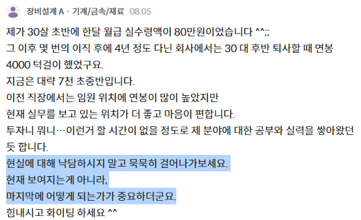 "제가 30살 초반에 한달 월급 실수령액이 80만원이었습니다. 그 이후 몇 번의 이직 후에 4년 정도 다닌 회사에서는 30 대 후반 퇴사할 때 연봉 4000 턱걸이 했었구요. 지금은 대략 7천 초중반입니다. (...) 현실에 대해 낙담하시지 말고 묵묵히 걸어나가보세요. 현재 보여지는게 아니라, 마지막에 어떻게 되는가가 중요하더군요." (장비설계 A · 기계/금속/재료)