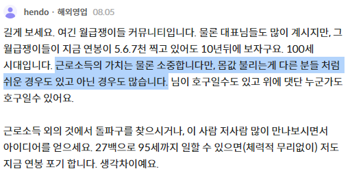 "길게 보세요. 여긴 월급쟁이들 커뮤니티입니다. 물론 대표님들도 많이 계시지만, 그 월급쟁이들이 지금 연봉이 5.6.7천 찍고 있어도 10년뒤에 보자구요. 100세 시대입니다. 근로소득의 가치는 물론 소중합니다만, 몸값 불리는게 다른 분들 처럼 쉬운 경우도 있고 아닌 경우도 많습니다. 님이 호구일수도 있고 위에 댓단 누군가도 호구일수 있어요. 근로소득 외의 것에서 돌파구를 찾으시거나, 이 사람 저사람 많이 만나보시면서 아이디어를 얻으세요. 27백으로 95세까지 일할 수 있으면(체력적 무리없이) 저도 지금 연봉 포기 합니다. 생각차이예요." (hendo · 해외영업)