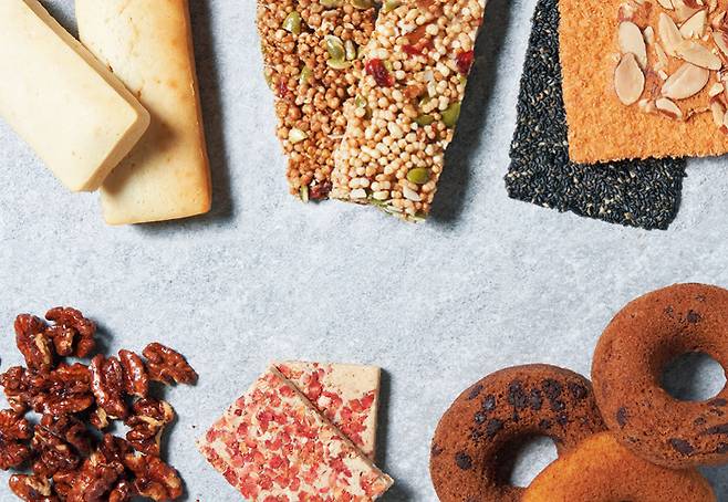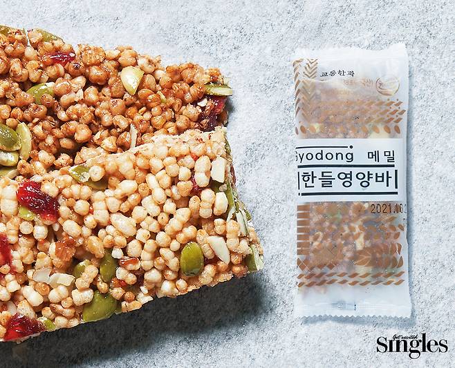 한과류 대한민국 식품명인 심영숙 명인이 운영하는 교동한과의 가뿐한 간식. 역사와 전통을 자랑하는 한과를 언제 어디서든 즐길 수 있도록 만든 아이디어가 반짝인다. 흑미, 현미, 메밀을 주재료로 아몬드, 호박씨, 크랜베리와 같은 맛을 다채롭게 채웠다. 한 손에 쏙 들어오는 아담한 사이즈로 사무실에서도 깨끗하게 처리할 수 있으며 한입 베어 물면 와르르 쏟아지는 곡물의 향이 속을 든든히 채운다.