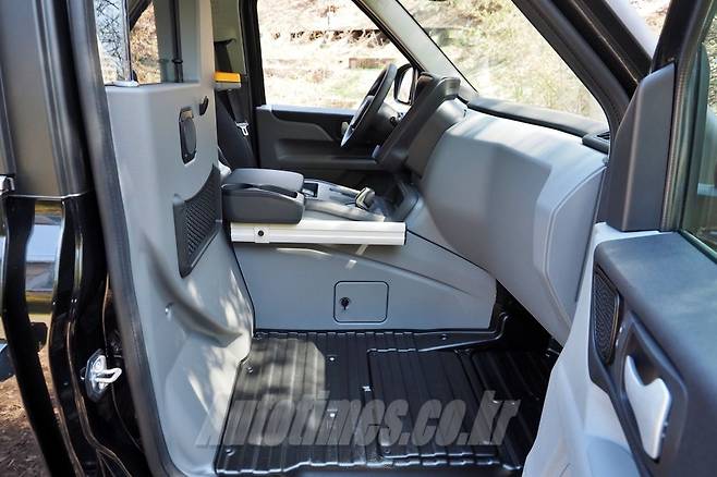 센터 터널에는 여러 종류의 수납함을 마련해 불편을 덜었다. 레일 형식의 컵홀더는 앞뒤로 움직일 수 있으며 옆에는 별도 옷걸이와 그물망을 설치해 보다 다양한 짐을 넣을 수 있다. 그리고 일반적으로 마련돼 있는 운전석 옆 동반석은 러기지 공간일 뿐 동반석이 아니다. 바닥면에 각종 벨트와 고리를 수납할 수 있는 공간이 뚫려 있고 내구성을 강조한 소재로 처리해 짐을 넣기에 부담이 없다. 대형 트렁크 또는 골프백 4~5개가 넉넉하게 실릴 만큼 공간이 넓다.