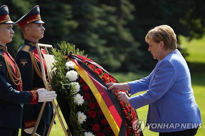 (모스크바 AP=연합뉴스) 앙겔라 메르켈 독일 총리가 20일(현지시간) 러시아 모스크바 크렘린궁 옆 무명용사의 묘에 헌화하고 있다. 메르켈 총리는 퇴임 전 마지막으로 이날 러시아를 방문해 블라디미르 푸틴 러시아 대통령과 회담한다.
