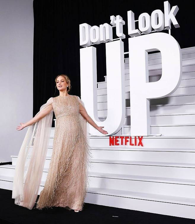 그는 5일(현지시간) 미국 뉴욕에서 열린 넷플릭스 영화 ‘돈 룩 업’ 시사회에서 눈부신 디올 드레스를 입고 레드카펫에 섰습니다.
