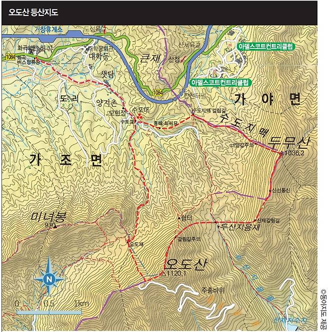 산행은 오도산과 두무산을 연계한 원점회귀 코스로 잡았다. 그래서 들·날머리를 합천 방면이 아닌 거창 쪽으로 택했다. 거창군 가조면 도리 화곡마을 버스정류장이 산행의 기·종점으로 약 15km 거리다. 문제는 오도산을 올랐다가 두산지음재까지 약 400m를 떨어진 다음 다시 두무산으로 약 300m를 가파르게 치올라야 한다. 또 두무산에서 내려서는 가파른 너덜길도 주의해야 할 구간이다.