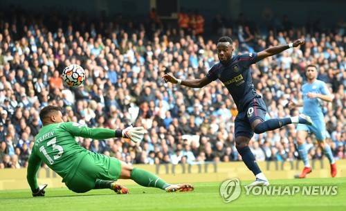 epa09527113 Manchester City goalkeeper Zack Steffen (L) saves a ball in front of Maxwel Cornet of Burnley (C) during the English Premier League soccer match between Manchester City and Burnley in Manchester, Britain, 16 October 2021. EPA/PETER POWELL EDITORIAL USE ONLY. No use with unauthorized audio, video, data, fixture lists, club/league logos or 'live' services. Online in-match use limited to 120 images, no video emulation. No use in betting, games or single club/league/player publications