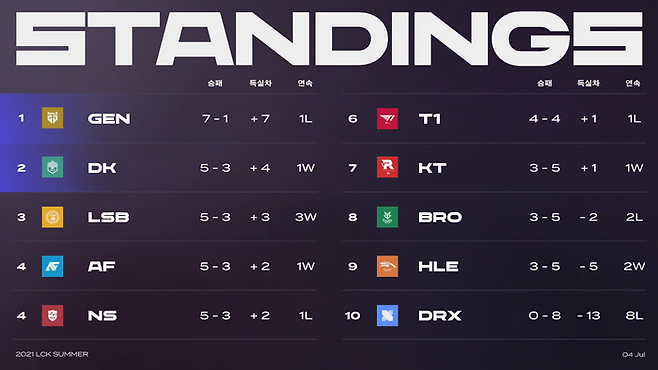 4일 2021 리그 오브 레전드 챔피언스 코리아(LCK) 서머 스플릿 4주차 경기가 모두 끝났다. 새 버전에 대한 적응이 끝나며 모든 팀은 이전과는 다른 모습을 보이기 시작했으며, 이로 인해 순위가 요동치며 1라운드 막판 그 어느 팀도 안심할 수 없는 모양새로 변모하고 있다.