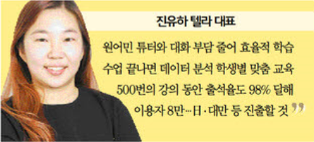 텔라 고객들은 매 수업마다 자신의 수업 데이터를 받아 볼 수도 있다. 진 대표는 “수업이 끝나면 채팅 데이터를 분석해 자동으로 대화 지표를 관리해준다”며 “더욱 정확하고 면밀하게 학습 성취 현황을 보여주고 학생별 맞춤형 수업을 진행할 수 있는 환경을 조성하고 있다”고 설명했다. 이어 “학생뿐만 아니라 튜터의 답변 속도와 어휘 사용 범위, 첨삭 횟수 등의 데이터도 면밀히 체크해 양질의 수업을 제공하는 데 힘쓰고 있다”고 덧붙였다.