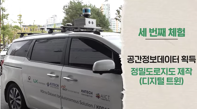 마지막으로 21개의 센서가 장착되어 있는 차를 타고 공간정보데이터를 구축하는 단계를 체험해 보았습니다. 3D, 3차원 라이다, 장애물 감지 레이더와 앞, 뒤, 측면 총 6개의 카메라 센서를 활용하여 3차원 공간정보를 만드는 차량인데 디지털 트윈을 구축하는데 중요한 역할을 한다고 합니다. 디지털 트윈이란 현실 세계의 기계나 장비, 사물 등을 3차원 디지털 공간 속 가상세계에 쌍둥이(twin)처럼 똑같이 구현한 것으로, 자율주행에 필요한 안전 정보와 공간정보를 제공하기 위해 제작합니다.