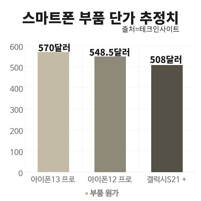 뿐만 아니라 경쟁모델인 갤럭시S21+(플러스) 부품 원가보다도 62달러 더 높다. 테크인사이트에 따르면 갤럭시S21+의 부품 원가는 508달러(60만2700원)로 추정된다.