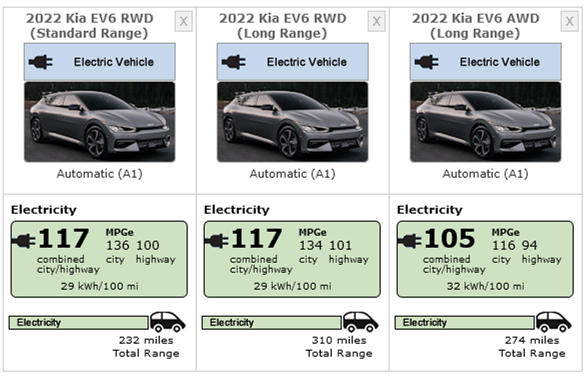 인사이드 이브이즈(Inside EVs) 등 외신에 따르면 EPA는 기아 EV6 3개 트림의 주행거리 및 효율 등급을 공식 발표했으며 롱레인지 모델은 1회 충전 주행거리가 499km(310마일)로 현대자동차 아이오닉5(482km)를 넘어선 것으로 알려졌다.