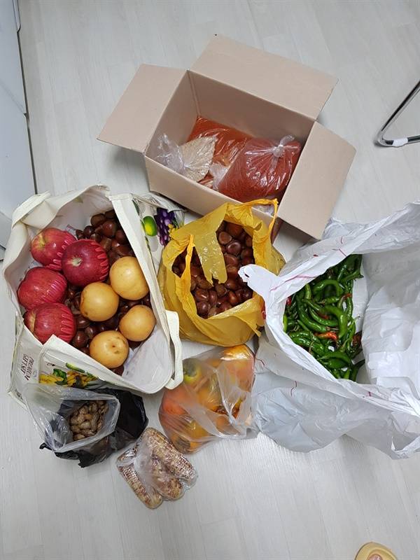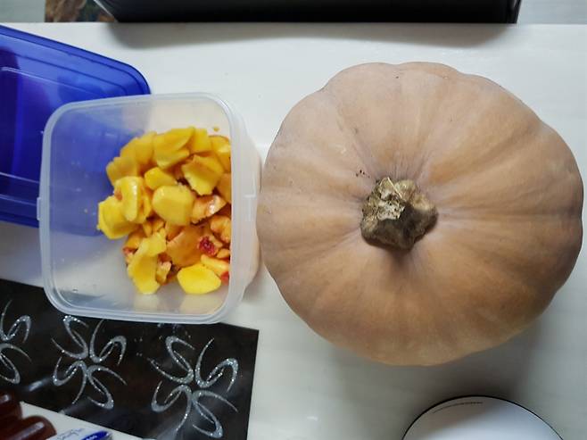 | ▲ 이웃 왕할머니의 선물들 손질한 복숭아와 늙은 호박 |